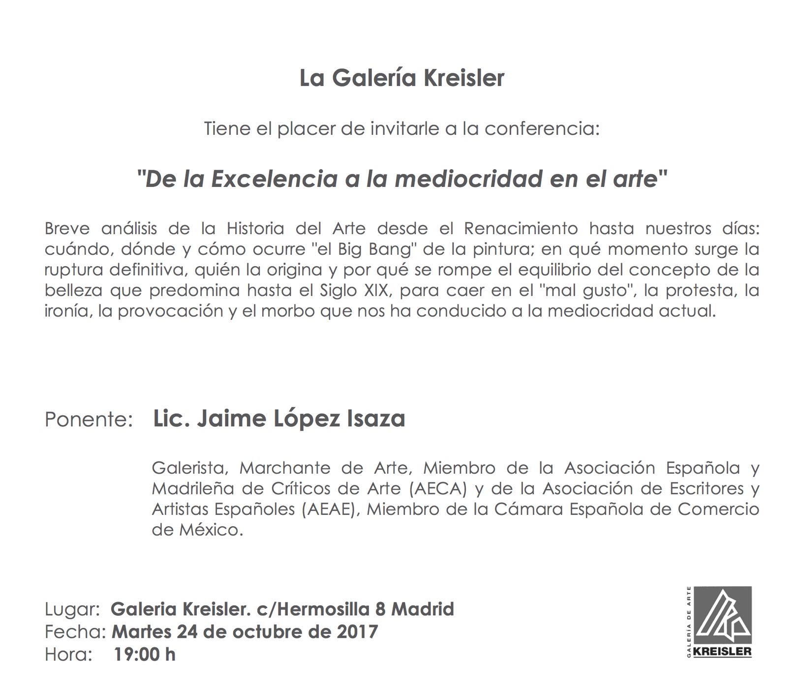 Reseña de la primera Conferencia presentada en Madrid el 28 de febrero del 2017 y reconocimiento público del acreditado galerista Don Juan Kreisler, fundador y director de la Galería que lleva su nombre -una de las de mayor prestigio de España y la más antigua, por sus 50 años de ininterrumpida actividad, en el Auditorio Cervantes de la Asociación de Escritores y Artistas Españoles.