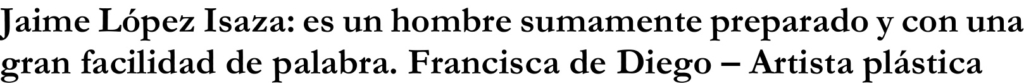 Como pintora habiendo trabajado con la Galería López Isaza por muchos años, celebro querido Jaime, con gran alegría, las ideas y valores del arte que ahora proyectas en el mundo, mismas que tanto hemos comentado a lo largo de todos estos años. Te felicito de todo corazón. La mancuerna Artista – Galerista, puede llegar a niveles muy profundos cuando existe el reconocimiento, el respeto y la confianza mutua. Jaime, amigo, celebro este camino del arte que tú y yo hemos compartido, porque en realidad es un camino de vida, donde optamos por los valores más altos. Lucille Wong